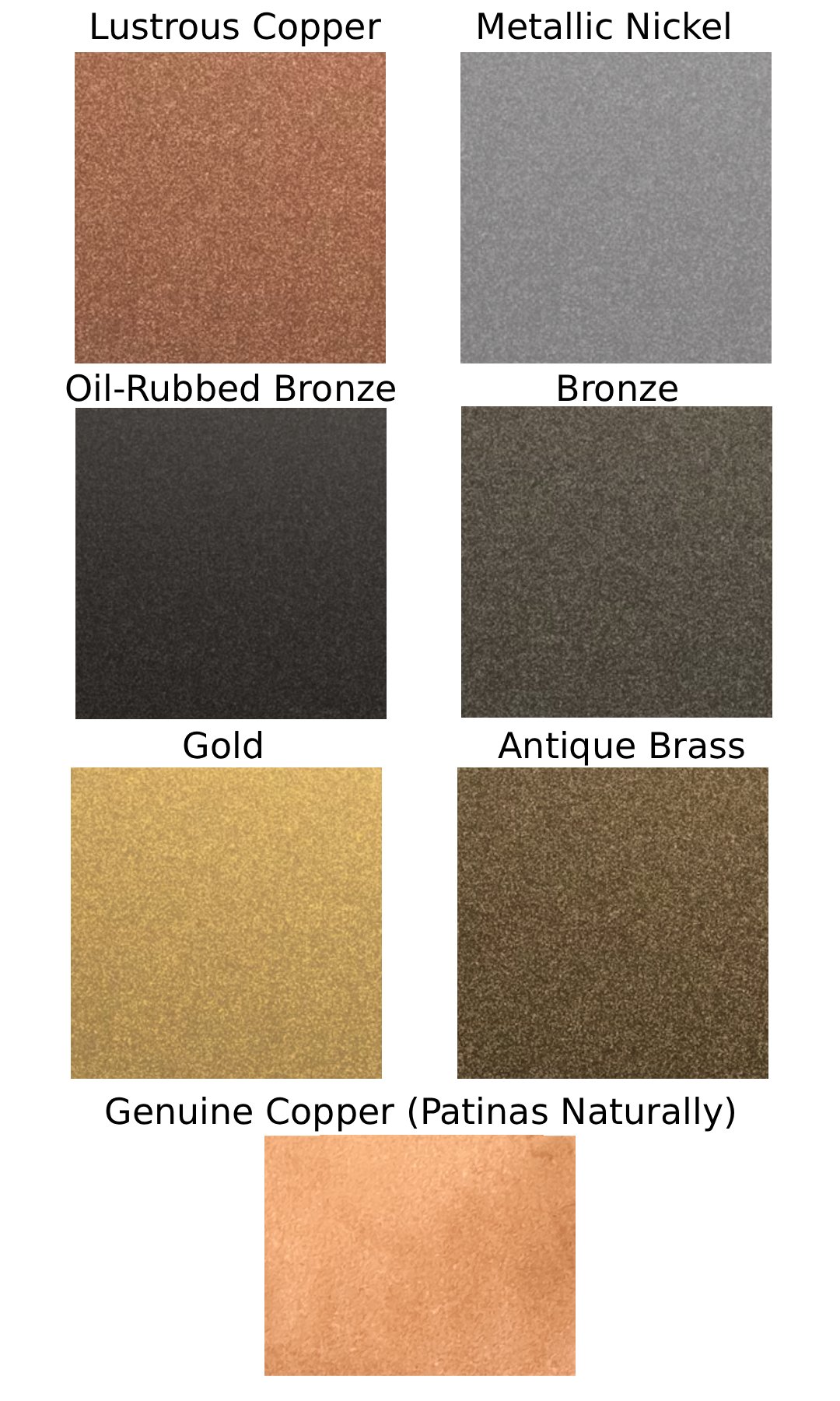 Genuine Metal Finishes: Plastic, primer, copper paint with real copper infused into the paint (behaves like real copper and will develop a patina over time)